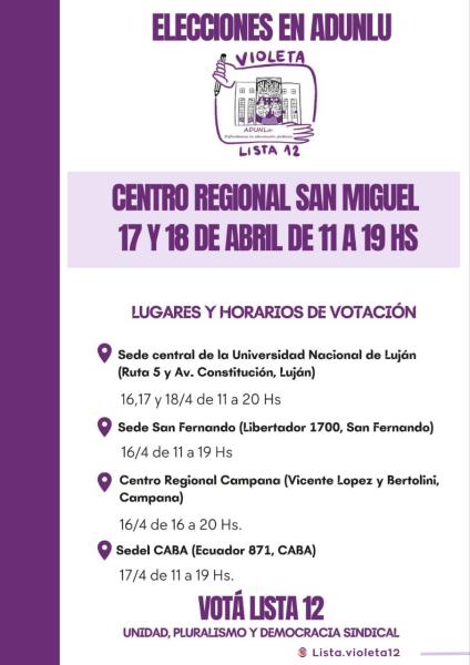Las elecciones de ADUNLu se llevan a cabo en distintas sedes. A continuación informamos los horarios y lugares de votación: