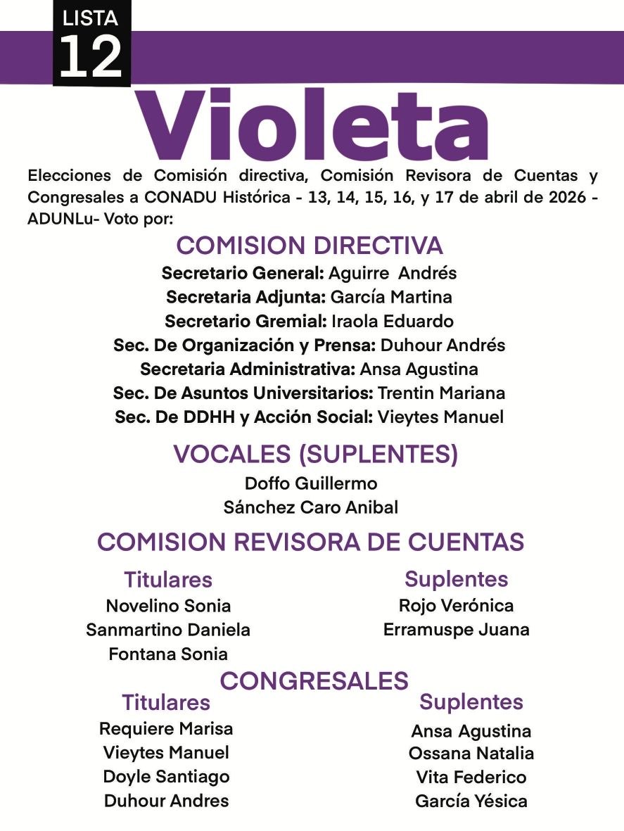 13 al 17 de abril elecciones en ADUNLU. Votamos la Lista Violeta para seguir construyendo un sindicato plural, participativo y democrático. Desde el punto de vista gremial, logrando el cumplimiento de nuestro CCT respecto de licencias, regularización y funcionamiento de la comisión paritaria. En el plano institucional, cumpliendo requerimientos del ministerio de trabajo e instancias de contralor fiscal y contable. En lo que tiene que ver con nuestra formación, realizando cursos de posgrado acordes a nuestras necesidades. En Derechos Humanos, jerarquizando espacios de memoria dentro y fuera de la UNLu. En Acción Social, reivindicando los mecanismos de solidaridad vigentes en nuestro sindicato, creando opciones de subsidio y asesoramiento. Defendiendo activamente la DASMI en el actual contexto socio-económico como una Obra Social solidaria, eficiente y transparente en el uso de los recursos, que acreciente sus prestaciones.